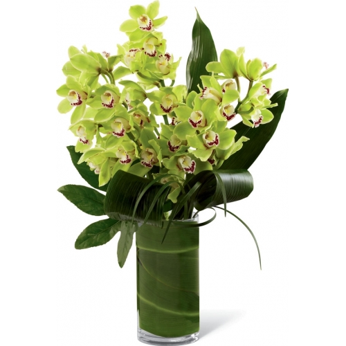 A spectacle of beauty and fresh color, this bouquet of cymbidium orchids is a picture perfect way to convey your every emotion. Elegant jade green cymbidium orchids, known for their longevity and stunning sophistication, are arranged amongst a variety of lush tropical greens to create an exceptional flower arrangement. Presented in a superior clear glass cylindrical vase lined with a ti leaf to add that extra special touch of charm, this bouquet will make your recipient's day one they won't soon forget.
