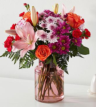 The Light of My Life Bouquet blossoms with brilliant color and a sweet sophistication to create the perfect impression! Pink Lilies make the eyes dance across the unique design of this flower bouquet, surrounded by the blushing colors of orange roses, lavender cushion poms, hot pink carnations, and lush greens. Presented in a blush glass vase, this fresh flower arrangement has been created just for you to help you send your sweetest thank you, happy anniversary, or thinking of you wishes.