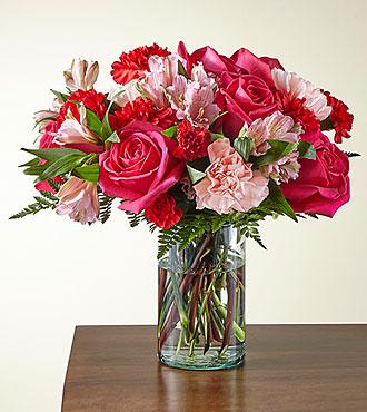 Blushing shades of pink blooms are nestled in lush greens to charm anyone's day. This bouquet is abundant with a classic assortment of pretty florals roses, alstroemeria and carnations to name a few.