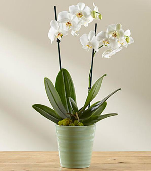 The Quiet Moments Orchid is a gift that exudes peace and tranquility with each perfectly petaled bloom. A gorgeous double stem phalaenopsis orchid plant arrives blossoming with large white long lasting flowers with lush green foliage at the base. Presented in a seafoam green ceramic cachepot container to add to the beauty of this stunning plant, this orchid is set to create an impressive thank you, thinking of you, or Mother's Day gift.