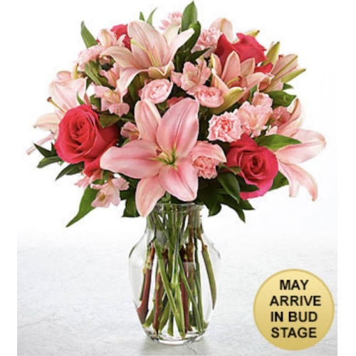 To create a special surprise for your recipient, our You Had Me at Pink Bouquet is full of blushing color to create a simply fantastic gift. This fresh flower bouquet brings together an array of pale pink blooms with pops of bright fuchsia to give them an eye-catching display they will love. Picked fresh for you, this bouquet is that perfect birthday, thank you, or thinking of you gift. Bouquet includes: pink LA Hybrid Lilies, fuchsia roses, pale pink Peruvian Lilies, pink mini carnations, and lush greens. Vase included.