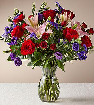 This dreamy jewel toned bouquet combines bold color and eye catching texture to make a statement. Featuring a thoughtful array of both roses and lilies, this dazzling assortment is bound to impress your recipient.