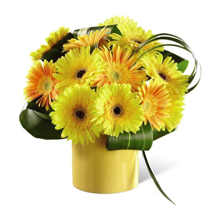 One of the best surprises in life is to receive flowers unexpectedly and this flower bouquet is ready to delight your recipient with energy and light in honor of life's most precious moments or for no reason at all, but to make them smile. Vibrant yellow gerbera daisies and orange gerbera daisies are arranged to show off their bright, brilliant color and texture accented with lily grass blades, and lush tropical leaves situated in a yellow cylindrical ceramic vase. An unforgettable birthday, get well, or congratulations gift!