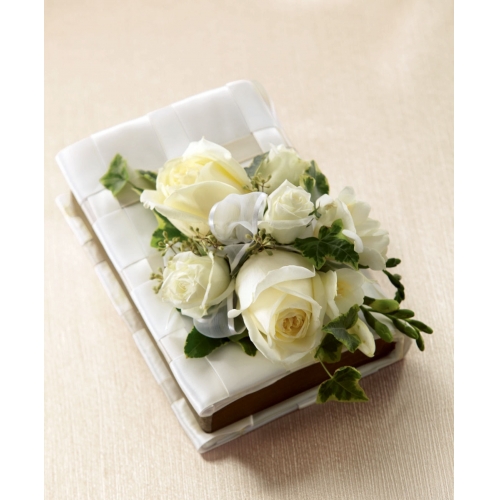 The FTD® Rose Charm™ Bouquet is the perfect bridal gift on the wedding day. An incredible bouquet of white roses, freesia, spray roses and lush greens are elegantly arranged on top of a bible accented with a basket weave pattern of white satin ribbon. A gift they will always hold dear.